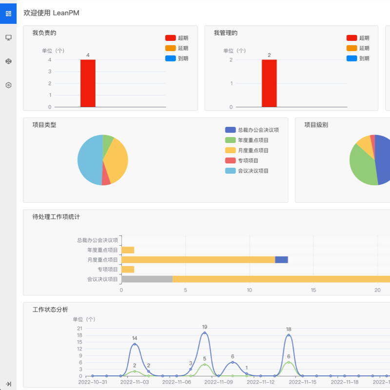 LeanPM 包含项目下发、项目变更、批量导入、项目回执、流程审批、流程附件及交付物上传/下载、项目监控、项目预警、标准审批流程模版、项目报表、项目授权、项目搜索、项目收藏、数据可视化、系统通知等相关功能。