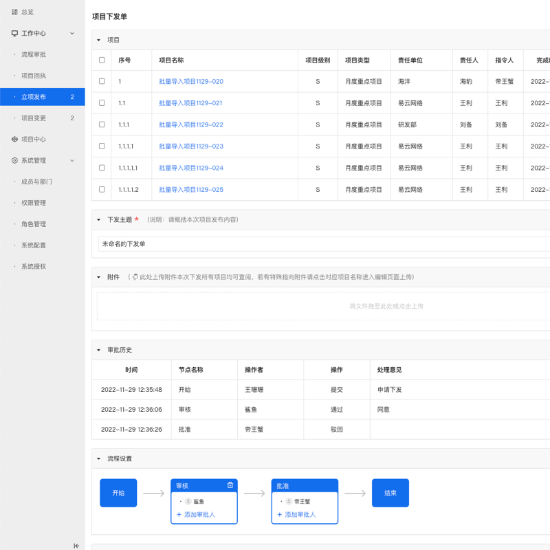 以工作单的形式集成了项目下发、审批、变更、回执(反馈)等相关功能界面,帮助用户快速完成项目相关工作